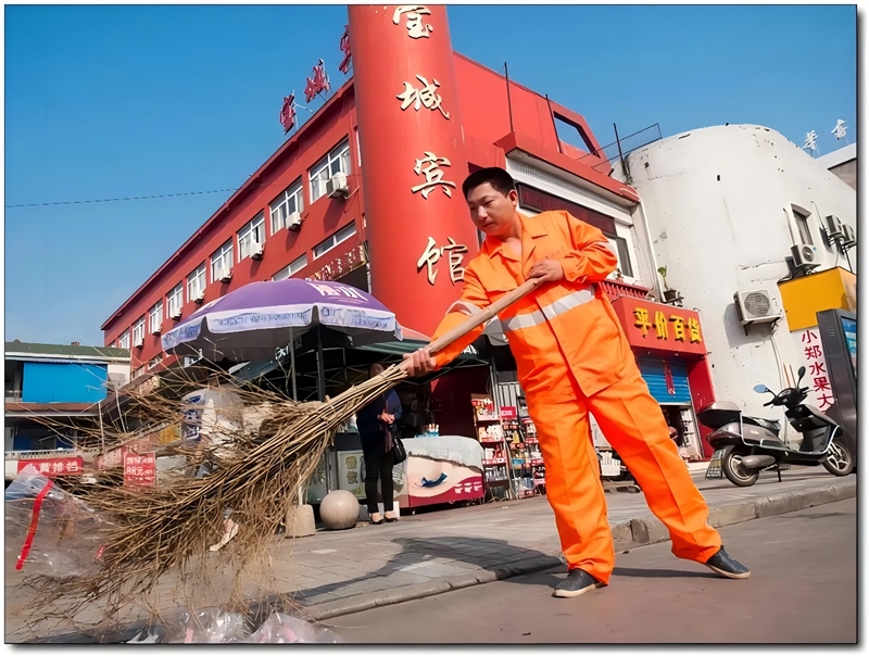 他每天早上四點(diǎn)多就準(zhǔn)時出現(xiàn)在街頭,先是拿著大笤帚把街道從頭到尾普掃一遍,忙到上午八點(diǎn)多鐘,接著就拎著小掃帚和簸箕定點(diǎn)清掃。到了下午兩點(diǎn)鐘,他會再把整條街普掃一遍,一直要忙到五點(diǎn)多才能下班。大熱天里,他身上的衣服經(jīng)常是濕了干、干了又濕,白色的鹽漬積了一層又一層,他卻全然不顧。